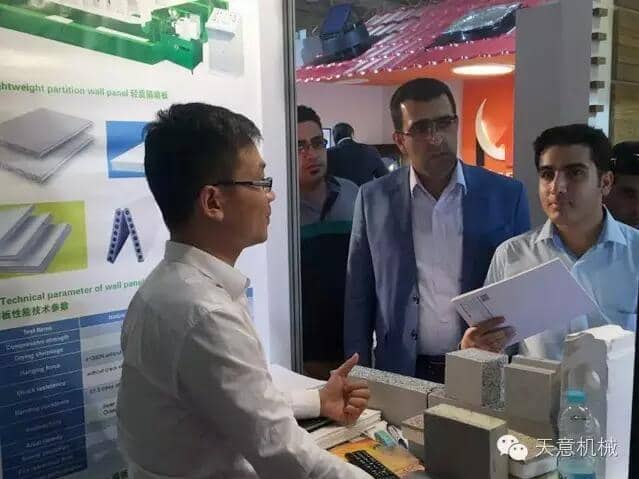 展會(huì)上,天意機(jī)械銷售經(jīng)理劉春剛細(xì)心的向前來(lái)咨詢的客戶,介紹了天意綠色建筑建材裝備在建筑行業(yè)內(nèi)的應(yīng)用優(yōu)勢(shì),通過(guò)觀看產(chǎn)品應(yīng)用視頻以及展現(xiàn)成品樣塊,使得天意展位前門庭若市。期間,外貿(mào)部銷售經(jīng)理劉春剛,專程拜訪了天意公司在伊朗年產(chǎn)50萬(wàn)平方的輕質(zhì)墻板生產(chǎn)線合作伙伴。詳細(xì)了解客戶的生產(chǎn)情況,幫助客戶免費(fèi)升級(jí)技術(shù)配方降低成本。