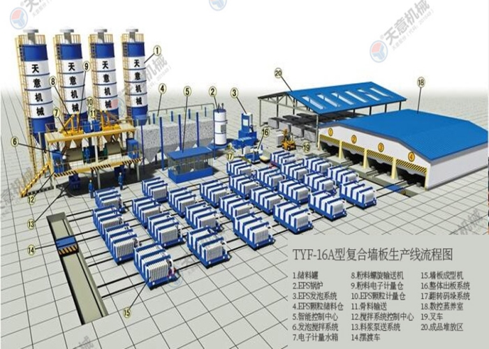 TYF-16A型復合墻板生產線是天意機械公司綜合國內外技術經驗,開發(fā)研制的新型墻體板材生產線。復合墻板生產線主要分為配料系統(tǒng)、攪拌系統(tǒng)、發(fā)泡系統(tǒng)、數控配電系統(tǒng)、墻板成型系統(tǒng)、料漿泵送系統(tǒng)、EPS預發(fā)系統(tǒng)、液壓循環(huán)系統(tǒng)、整體出板系統(tǒng)。