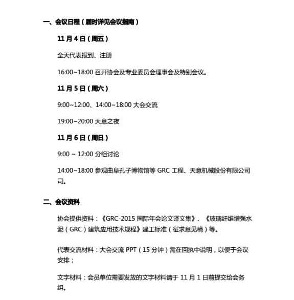 2014 年南京年會以來的新技術(shù)、新材料和新裝備成果;展示上海迪士尼GRC 典型示范工程風(fēng)采;研討 GRC 技術(shù)與產(chǎn)品研發(fā)方向;匯報 2015 年迪拜國際 GRC 年會及國際 GRC 發(fā)展方向;介紹《玻璃纖維增強水泥(GRC)建筑應(yīng)用技術(shù)規(guī)程》建工標準制定情況;觀摩曲阜孔子博物館等 GRC 工程。為滿足與會者的要求,大會還將特邀相關(guān)部門專家作裝配式建筑發(fā)展導(dǎo)向性報告。
