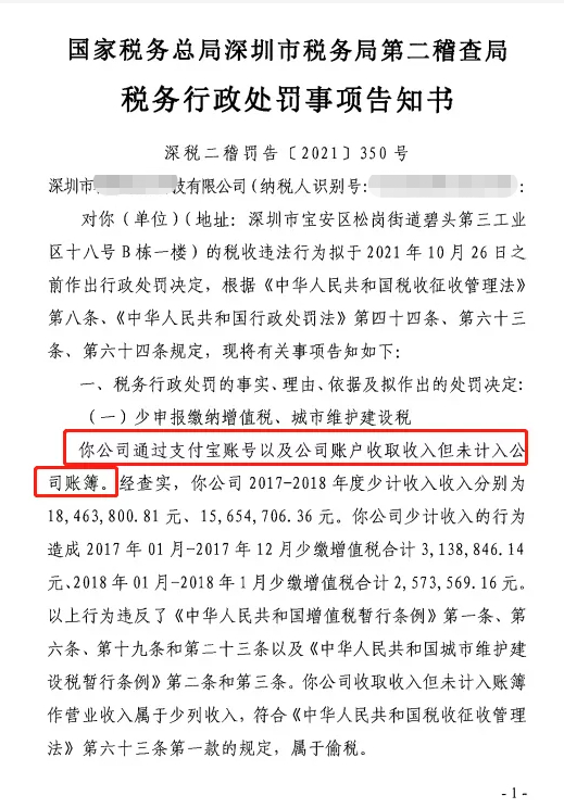 深圳某科技公司,通過支付寶賬號以及公司賬號收取收入,導(dǎo)致少計收入3411.85萬元,造成少繳增值稅571.24萬元以及城市維護建設(shè)稅。此外,稅務(wù)局通過核定征收的方式,查明該公司少繳企業(yè)所得稅37.43萬元。最終,上述公司被處百分之五十的罰款,共計3243277.46元。